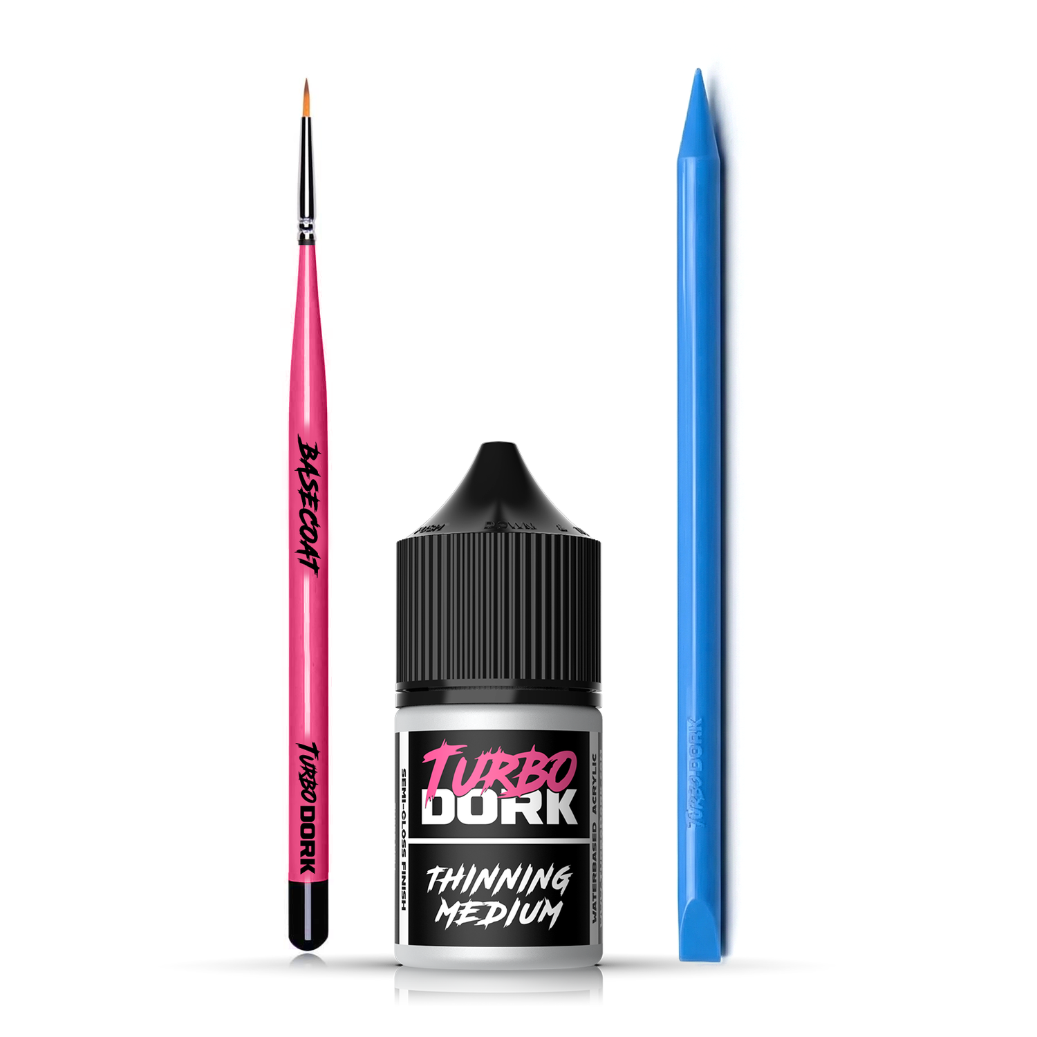 JumpStart your hobby journey with all the tools you need for shiny success. This kit includes 1x Silicone Mixing Stick in a random color, 1x #1 Size base coat paint brush in our Fauxlinksy synthetic bristle blend, and a 22ml size bottle of our Thinning Medium.